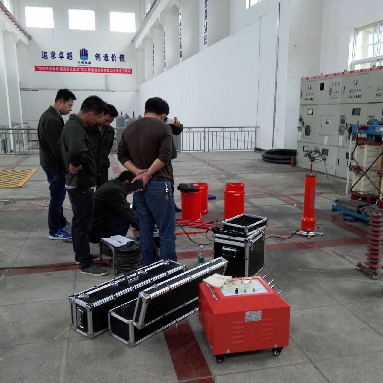 此次培訓的重點設備是YTC850-135kVA/108kV變頻串聯諧振試驗裝置。我公司的該設備為專利產品,諧振電源調頻及功率元件使用先進的日本進口的優質元器件,設計的是諧振式濾波電路,能改善輸出電壓的波形畸變,獲得很好的正弦波形,有效的防止了諧波峰值對試品的誤擊穿。變頻電源保護功能強,穩定性好;具備具備全自動(自動調諧、自動升壓)、全手動(手動調諧、手動升壓)以及半自動(自動調諧、手動升壓及手動調諧、自動升壓)的多種工作模式,可任意切換使用;操作方便;采用220V或380V單相電源,方便現場取電。
