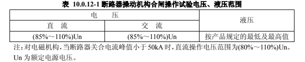 1)當操作電壓、液壓在表 10.0.12-1 范圍內時,操動機構應可靠動作