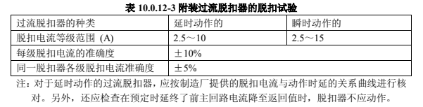 3)附裝過流脫扣器的,其額定電流規(guī)定不小于 2.5A,脫扣電流的等級范圍及其準確度,應符合表 10.0.12-3 的規(guī)定。