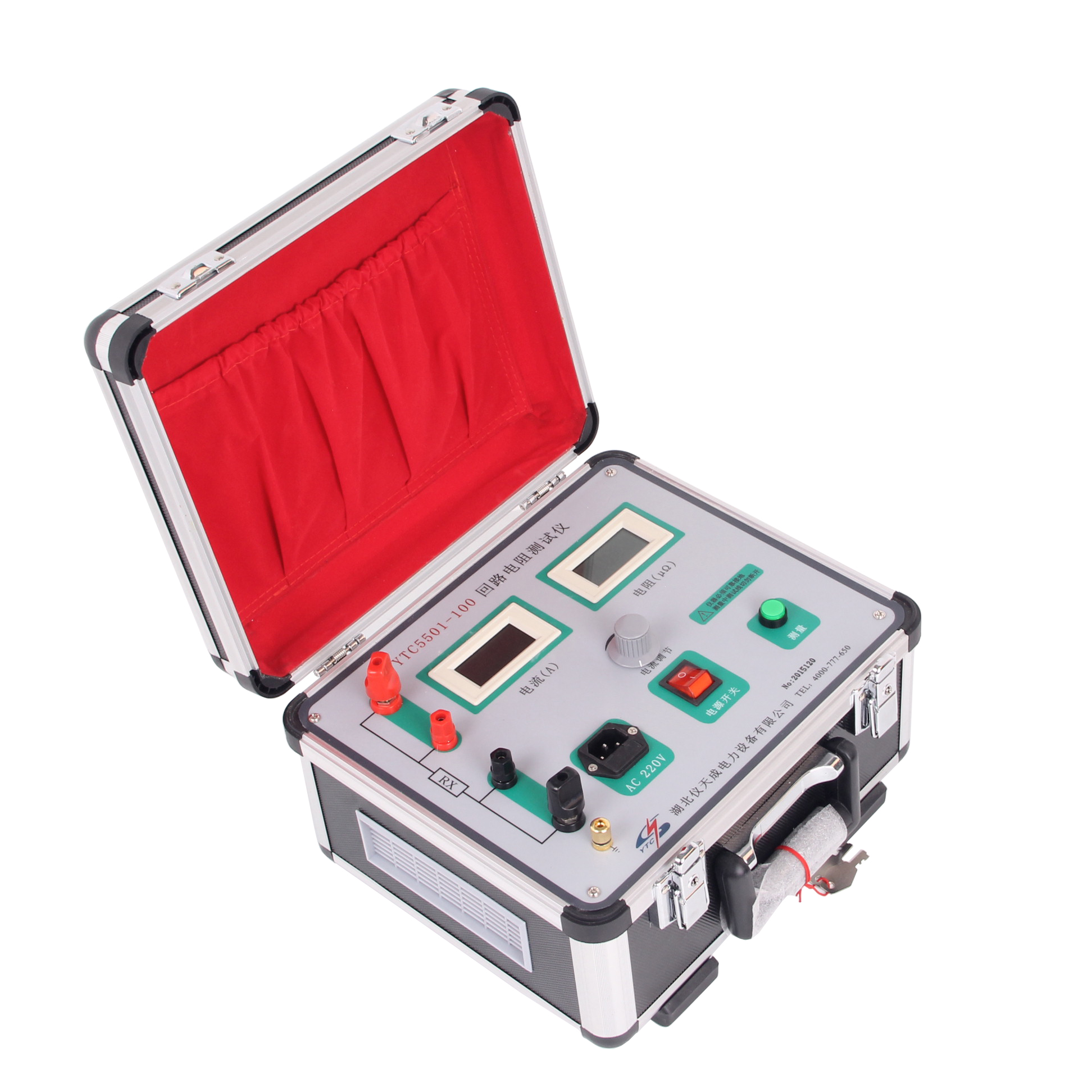 2. 按下測量開關(guān),調(diào)節(jié)電流調(diào)節(jié)旋鈕,使電流升至100A,此時電阻表的顯示值即為被測接觸電阻值。補(bǔ)充說明:若顯示屏顯示“1”,表明被測回路電阻值超出量程;若實(shí)際測量電流未達(dá)到100A(設(shè)實(shí)際電流為Io,對應(yīng)電阻表顯示值為Uo),則實(shí)際電阻值計算公式為:R =(100×Uo÷Io)μΩ。