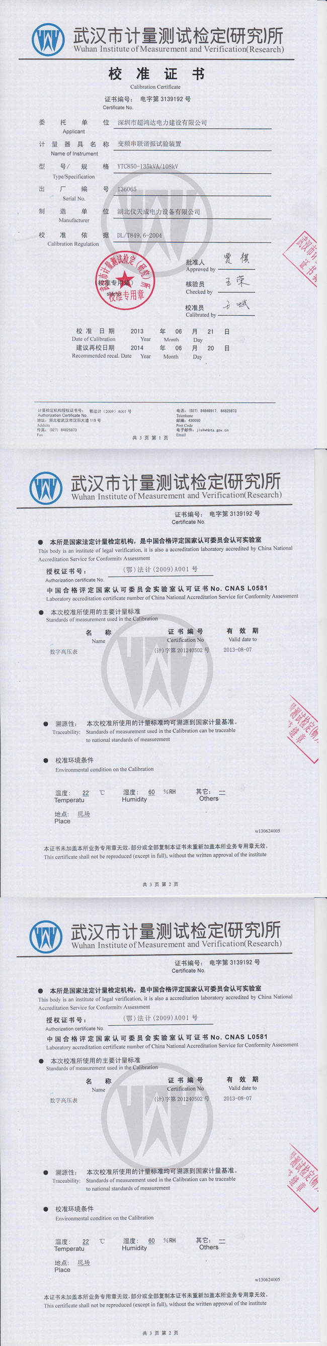 YTC850系列變頻串聯(lián)諧振試驗裝置資質(zhì)證書